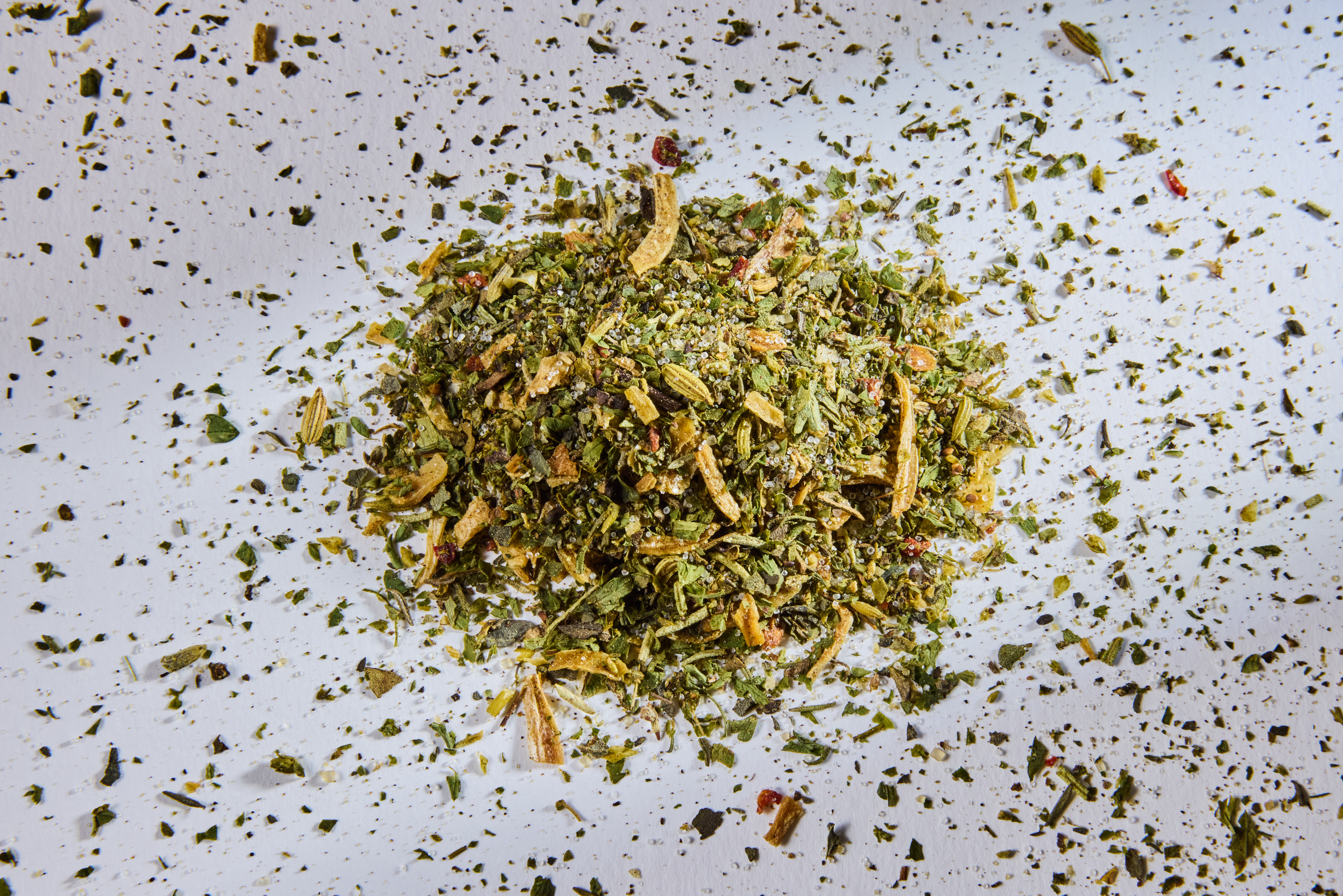 Röstzwiebel, Petersilie, Meersalz, Pfeffer schwarz, Basilikum, Oregano, Paprika, Bohnenkraut, Rosmarin, Fenchel, Thymian, Rohrzucker, Rapsöl, Lavendel