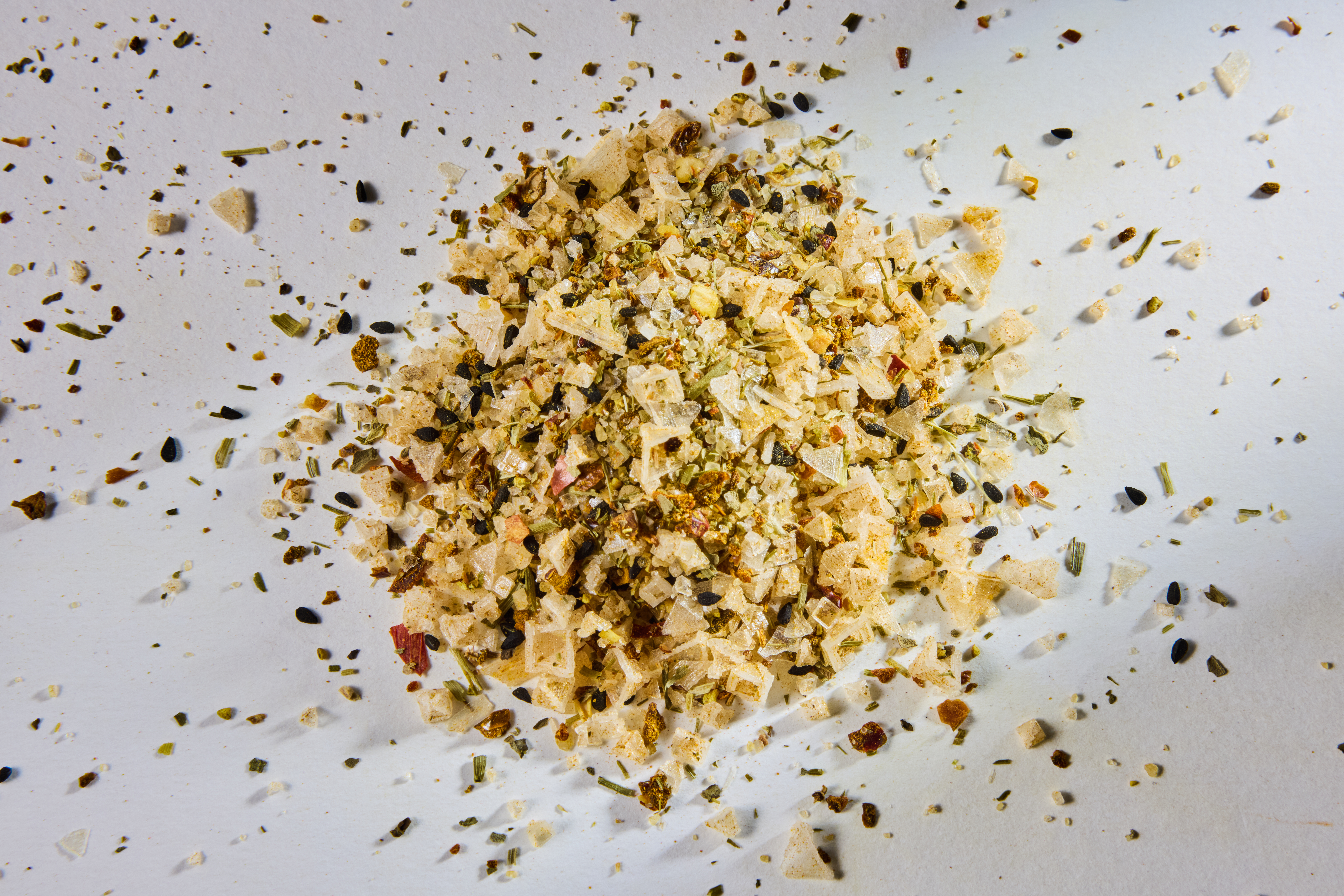 Fleur de Sel, Tomaten, Schwarzkümmel, Paprika, Knoblauch, Schnittlauch, Chili, Kurkuma, Basilikum, Pfeffer, Zitronenschale, Muskatnuss