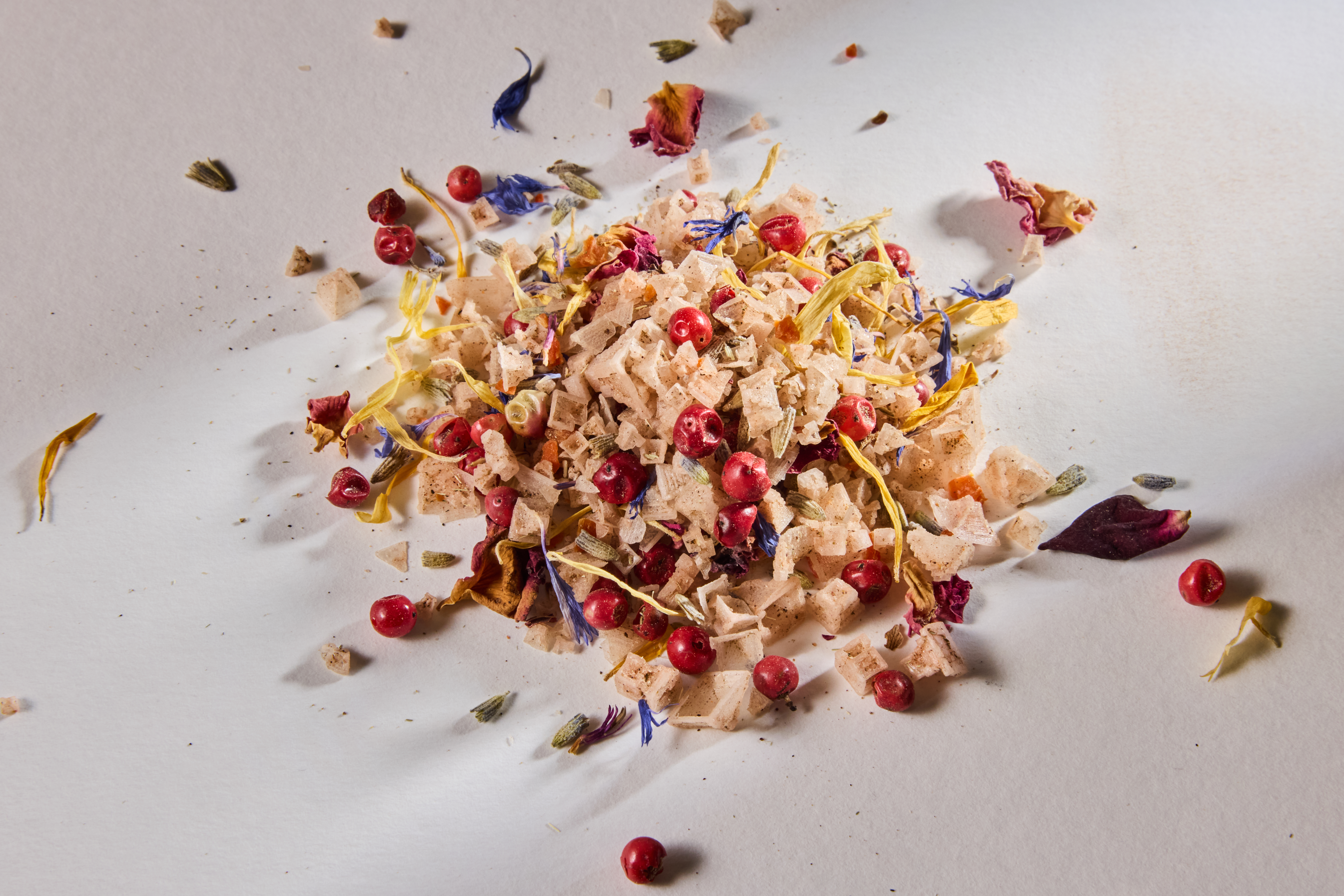 Blütenmix: Der Blütenmix aus verschiedenen essbaren Blüten fügt eine zusätzliche florale Dimension hinzu. Er verstärkt die blumige Leichtigkeit des Gewürzes und macht es noch komplexer.