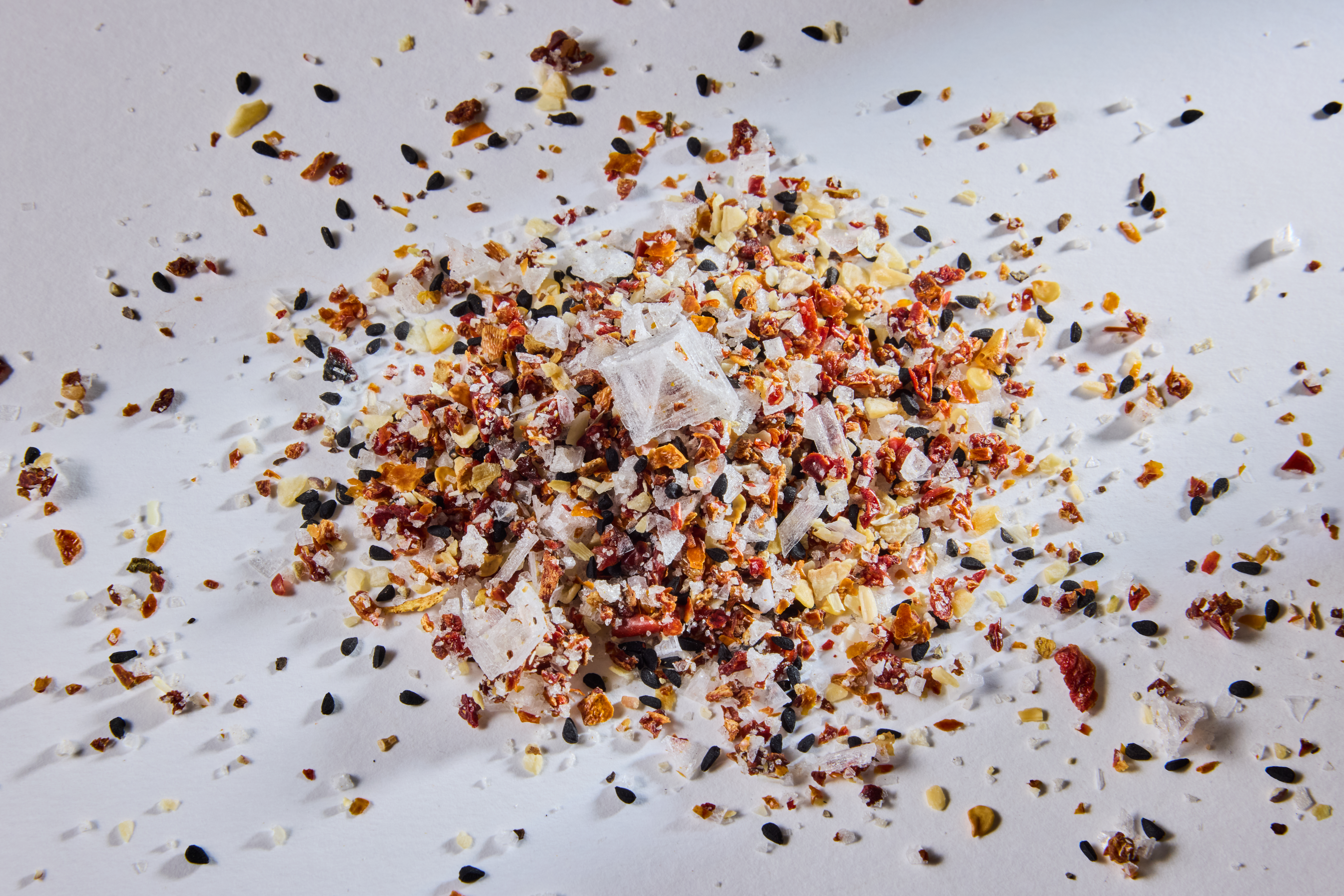 Fleur de Sel, Indische Sonnenflocken (Salz), Paprika, Tomaten, Schwarzkümmel, Knoblauch, Zwiebel, Pfeffer, Chili, geräuchertes Paprikapulver